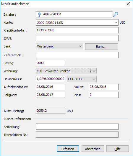 Dieses Dialogfenster entspricht weitgehend dem Dialogfenster "Festgeld anlegen". Allerdings gibt es bei Krediten kein Feld zur Zinsberechnungsmethode und der Betrag auf dem Konto ist natürlich positiv (Festgeld negativ). - Ergänzen oder ändern Sie ggf. die Angaben in den Eingabefeldern.