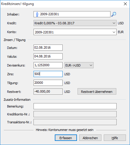 Die Währung ist immer die Währung des Kredits, die Sie bei der Aufnahme des Kredits definiert haben. Dadurch ist die Währungskombination immer Kreditwährung -> Kontowährung. Die Eingabe des Wechselkurses kann analog den anderen Dialogen beidseitig erfolgen.