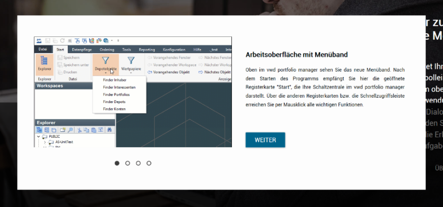 Über den Button "Weiter" oder die unteren runden Navigationselemente springen Sie zu den nächsten Seiten der Kurzeinführung.