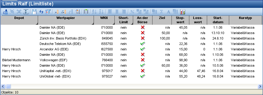 Öffnen Sie den Workspace eines Limitordners, z. B. durch einen Doppelklick auf den Limitordner im Explorer. Die relevanten Auswertungen finden Sie im Workspace auf dem Worksheet "Limits". Wählen Sie dort das Worksheet "Limitliste", die eine Liste aller Wertpapierlimits darstellt, die für diesen Ordner erfasst wurden.