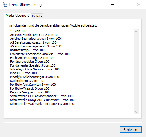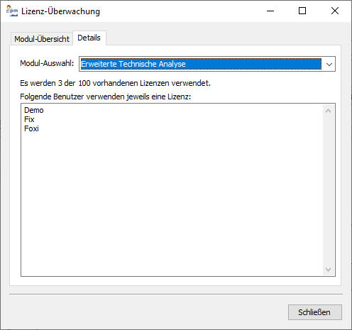 Auf der Registerkarte "Details" können Sie über die Auswahlliste ein bestimmtes Modul selektieren. Sie erhalten die Informationen zum Modul und zusätzlich eine Liste der Benutzernamen, die eine Lizenz verwenden. So verschaffen Sie sich einen schnellen Überblick, welche Module durch welche Anwender "besetzt" sind. - Wählen Sie den Button "Schließen", um das Dialogfenster "Lizenz-Überwachung" zu schließen.