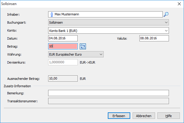 Wählen Sie links in den Konto-Transaktionstypen in der Kategorie "Zinsen" den Transaktionstyp "Sollzinsen" per Mausklick. Es erscheint das Dialogfenster "Sollzinsen".