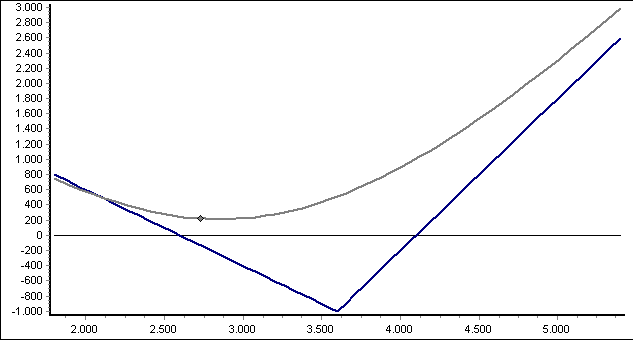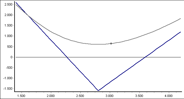 Die beiden Break-Even sind hier nicht symmetrisch, der Break-Even liegt in der erwarteten Richtung näher am Basispreis.