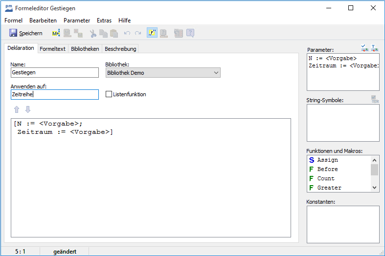 Das Eingabeobjekt dieser Formel ist immer eine Zeitreihe. Geben Sie daher auf der Registerkarte "Deklaration" im Feld "Anwenden auf" den Typ "Zeitreihe" ein. Bleibt dieses Feld leer, wird als Typ automatisch "Objekt" eingesetzt, d. h., die Formel ist dann auf alle Objekttypen anwendbar.