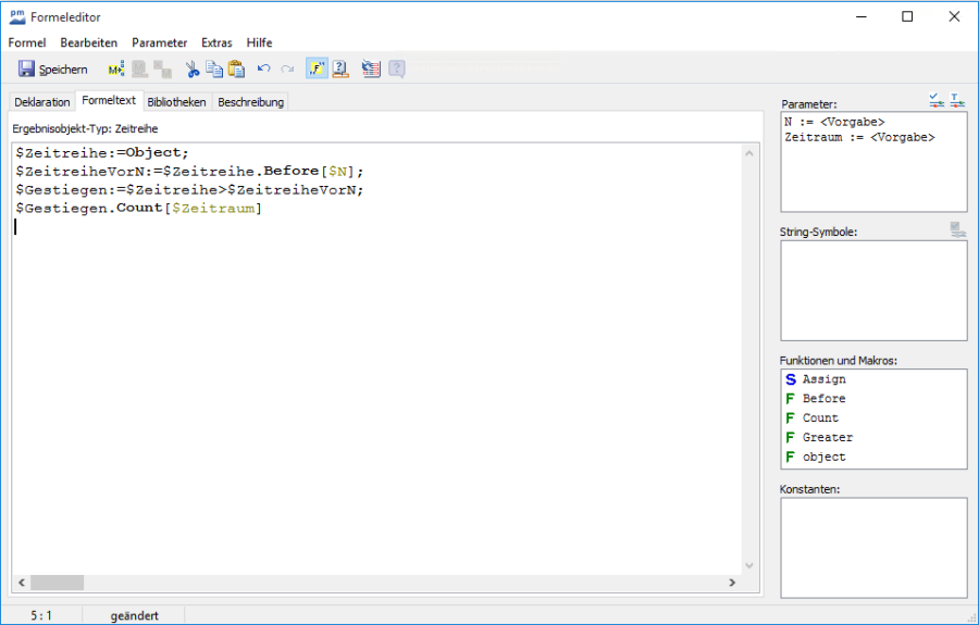 Speichern Sie das neu angelegte Makro "Gestiegen". Sie können es jetzt in anderen Formeln verwenden, z. B. um mit der Formel "Close[].Gestiegen[]" in einem Chart eine zusätzliche Zeitreihe einzublenden.