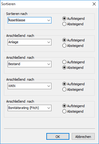 Der Infront Portfolio Manager bietet Ihnen die Möglichkeit, Tabellen nach bis zu 5 Kriterien (mehrstufig) zu sortieren. Gehen Sie dazu wie folgt vor: