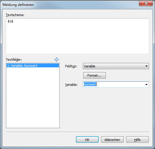 In diesem Fall kann die Meldung durch Variable vervollständigt werden. Hierzu kann man im unteren Bereich eines der Datenfelder, die man im entsprechenden Dialogfenster ausgewählt hat, verwenden, um die Meldung zu ergänzen.