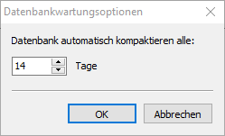 OPTIONEN… | Wählen Sie diesen Befehl, um im erscheinenden Dialogfenster ein Intervall für die regelmäßige automatische Datenbank-Kompaktierung Ihrer MS-SQL-Datenbank einzugeben. Die Standardeinstellung beträgt 14 Tage. |