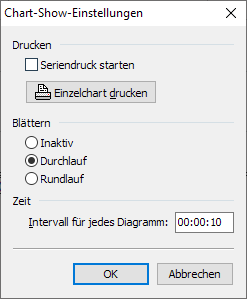 Mit einem Doppelklick auf die Statusanzeige der Chart-Show (z. B. Chart 6 von 29) öffnen Sie das Dialogfenster "Chart-Show-Einstellungen".