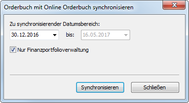 Nehmen Sie dann im erscheinenden Dialogfenster "Orderbuch mit Online-Orderbuch synchronisieren" die gewünschten Einstellungen für die Konfiguration vor. Wählen Sie den zu synchronisierenden Datumsbereich aus und legen Sie fest, ob Sie alle betroffenen Orders oder nur die Orders aus Portfolios mit der Eigenschaft "Finanzportfolioverwaltung" synchronisieren möchten.