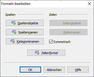 Wenn die Matrix symmetrisch ist (d. h., wenn sie die gleichen Objekte in den Zeilen und in den Spalten enthält, und wenn die Zellenformel den gleichen Wert liefert, unabhängig davon, welches das Zeilen- und welches das Spaltenobjekt ist), dann kann das Kontrollkästchen "Symmetrisch" aktiviert werden. In diesem Fall werden die Ergebnisse der Spaltenformel und der Formel für die Spaltennamen auch für die Zeilen verwendet. Die Formeln für die Zeilen brauchen dann nicht separat angegeben werden.