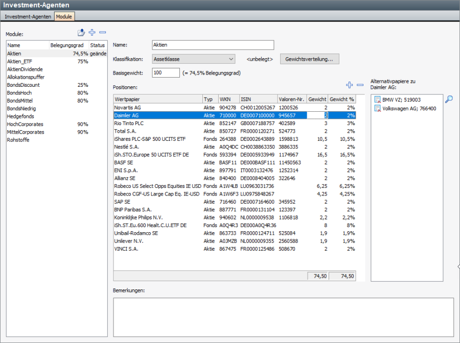 Jede Position hat eine Liste von zulässigen Alternativpapieren. Diese Alternativpapiere können das favorisierte Wertpapier vertreten, wenn sie schon vorher Bestandteil eines Portfolios sind.