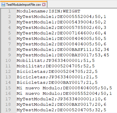 - Existiert bereits ein Modul mit diesem Namen, dann werden die ISINs gelöscht und die neuen importiert.