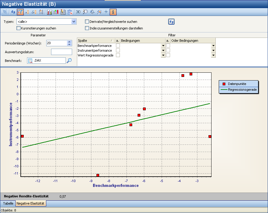 Diese Auswertung liefert sowohl eine Tabelle als auch eine Grafik zur Visualisierung der negativen Elastizität, die sich standardmäßig öffnet. Über die bekannten Registerkarten unten im Auswertungsfenster wechseln Sie zwischen Tabellen- und Grafikansicht. Sie finden die Auswertung im Workspace von Wertpapieren auf dem Worksheet "Risiko".