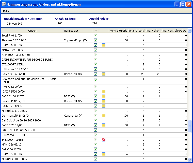 Es erscheint das Dialogfenster "Nennwerte von Optionsorders anpassen". In diesem wird nach Datenanalyse eine Liste der Aktienoptionen angezeigt, zu denen Orders existieren.