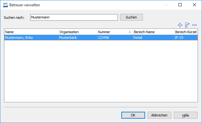 Wählen Sie auf der Registerkarte "Datenpflege" den Befehl BETREUER im Menü des Icons "Objekte verwalten". Es erscheint das Dialogfenster "Betreuer verwalten".
