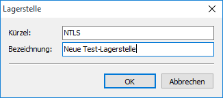 Geben Sie im erscheinenden Dialogfenster "Lagerstelle" Kürzel und Bezeichnung der neuen Lagerstelle ein und bestätigen Sie die Eingabe mit "OK".