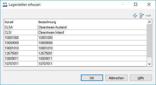 Wählen Sie auf der Registerkarte "Datenpflege" den Befehl LAGERSTELLEN im Menü des Icons "Objekte verwalten". Es erscheint das Dialogfenster "Lagerstellen erfassen".