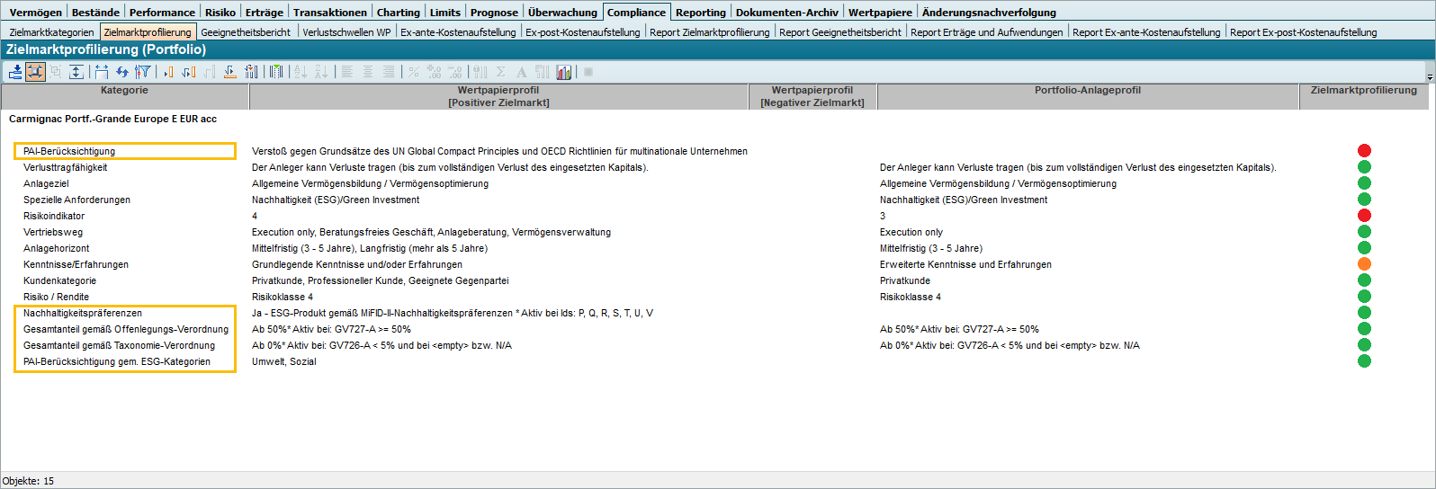 Auswertungen "Zielmarktprofilierung (Portfolio)" und "Zielmarktprofilierung (Pre-Trade)"