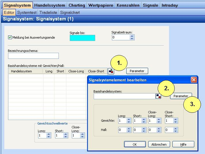 Markieren Sie den Ordner mit der rechten Maustaste und wählen Sie im Kontextmenü den Befehl NEU, SIGNALSYSTEM. Oder wählen Sie den Befehl SIGNALSYSTEM im Menü des Icons "Objekte anlegen" auf der Registerkarte "Datenpflege", dann wird das neue Signalsystem immer unter dem Signalordner "Signalsysteme" im Explorer (standardmäßig unter "Auswertungen") angelegt. Ist dieser nicht vorhanden, so legt der vwd portfolio manager automatisch einen solchen an. Vergeben Sie im erscheinenden Dialogfenster "Signalsystem-Eigenschaften" im Feld "Name" eine aussagekräftige Bezeichnung und bestätigen Sie mit "OK". Es wird ein Signalsystem-Objekt mit diesem Namen unter Ihrer Signalkontrolle angelegt und darunter ein Ordner "Eingabe". Außerdem wird der Workspace mit dem Editor zu den Signalsystem-Eigenschaften geöffnet.