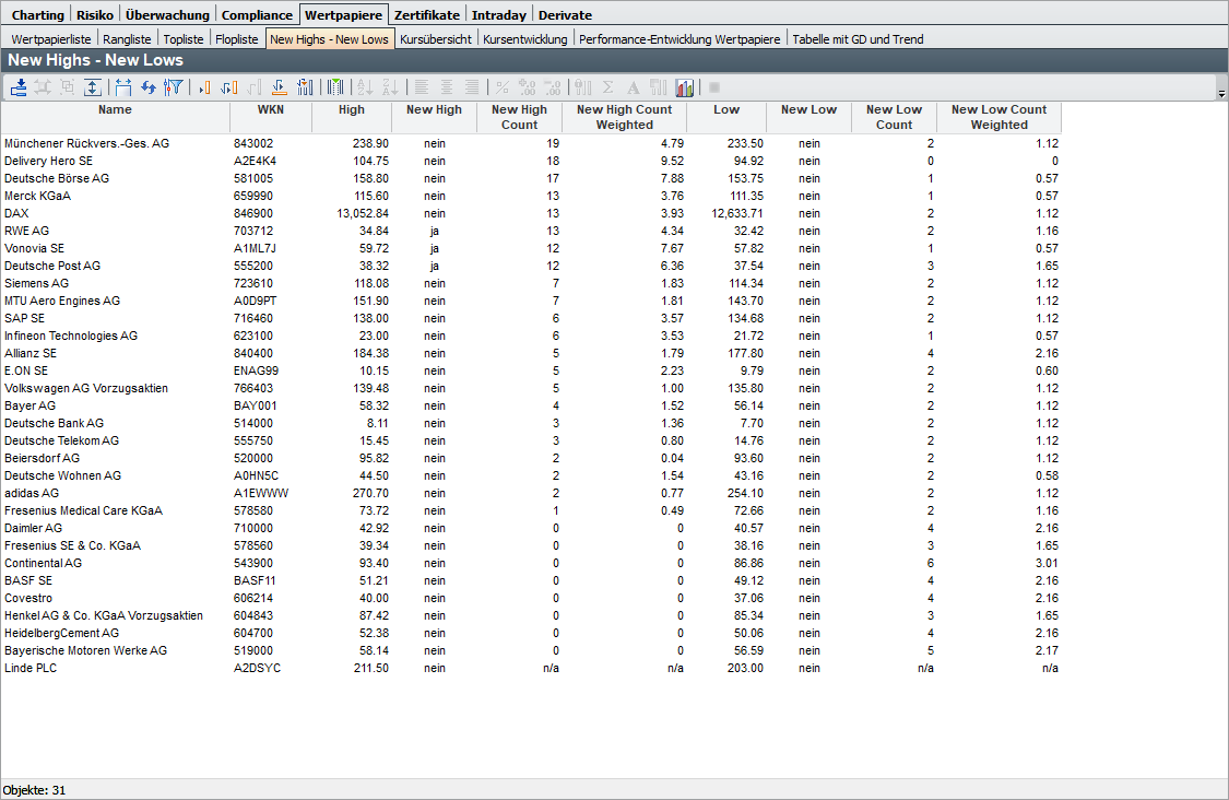 Die Auswertung "New Highs – New Lows" liefert für die Wertpapiere eines Ordners bzw. eines Filters eine tabellarische Darstellung der in einem bestimmten Zeitraum erreichten Höchst- bzw. Tiefstkurse.