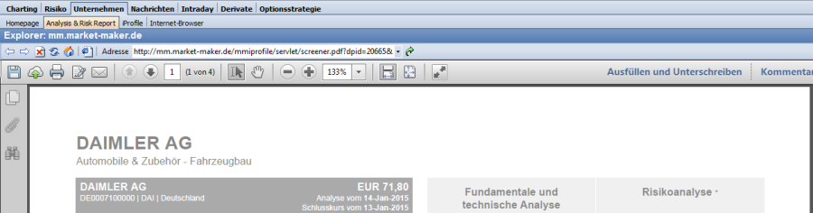 Um die Unternehmensanalysen auszudrucken, können Sie das Icon "Drucken" aus der Symbolleiste des Adobe Readers verwenden, oder die bekannten Befehle im Hauptmenü Ihres Infront Portfolio Manager.