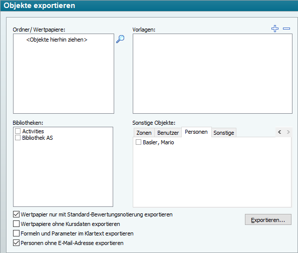 Im sich öffnenden Worksheet "Objekte exportieren" können Sie die Objekte angeben, die Sie exportieren möchten. Klicken Sie auf das Icon "Suchen" und wählen Sie die Explorer-Objekte über die Objektsuche aus. Oder ziehen Sie ein oder mehrere Objekte (Ordner, Filter, Signalkontrollen, Signalsysteme, Handelssysteme, Inhaber) per Drag & Drop aus dem Explorer in das Feld "Ordner" oben links. Für Wertpapiere können Sie genauer spezifizieren, wie diese exportiert werden sollen und so die Datenmenge reduzieren. Enthaltene Wertpapiere können Sie wahlweise vollständig, nur mit der Kursnotierung am Standard-Bewertungsplatz oder auch ganz ohne Kursdaten exportieren. Aktivieren Sie dazu die entsprechenden Kontrollkästchen im Worksheet "Objekte exportieren". Personen werden standardmäßig ohne ihre hinterlegten E-Mail-Adressen exportiert. Beachten Sie dazu auch die Ausführungen im Abschnitt Export und Import von Personen und Personenverknüpfungen. Exportiert werden die Objekte mit allen darunter angelegten Elementen. Die Objekte müssen nach dem Importieren ggf. noch neu ausgewertet werden. Vorlagen wählen Sie zum Export aus, indem Sie auf das Icon "Vorlage hinzufügen" klicken und die Vorlagen aus der Auswahlliste wählen. Bibliotheken wählen Sie im Feld unten links aus, indem Sie die entsprechenden Kontrollkästchen aktivieren. Im Feld "Sonstige Objekte" wählen Sie z. B. Chartformelelemente, Benutzerdefinierte Felder, Portfolio-Profile, Assetklassen, Assetklassifikationen, Alert-Definitionen, Translation Memories, Zonen, Benutzer, Personen oder Sonstige (z. B. Kursdaten-Export-Konfigurationen, Renditekurven…) aus.