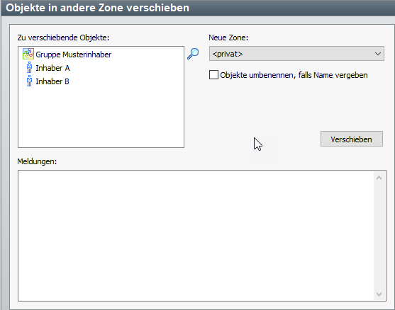 Die Objekte werden in die neue Zone verschoben. Im Feld "Meldungen" informiert Sie Ihr Infront Portfolio Manager über Einzelheiten.
