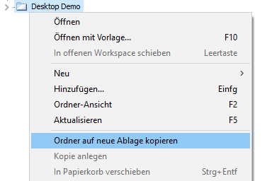 Markieren Sie ein Ordner-Objekt (z. B. Ordner, Filter, Inhaber, Portfolio, Gruppe – Ordner-Objekte sind alle Objekte, die wiederum andere Objekte beinhalten können) im Explorer und wählen Sie im Kontextmenü den Befehl ORDNER AUF NEUE ABLAGE KOPIEREN.