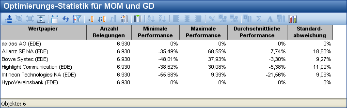 Nach oder während der Optimierung kann eine Statistik für die Optimierung ausgewertet werden. Dabei wird jedes optimierte Wertpapier angezeigt.
