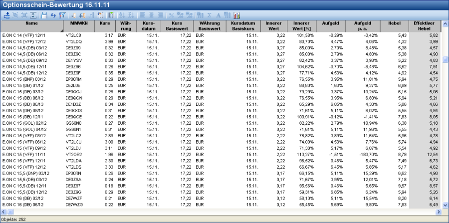Die Tabelle "Optionsschein-Bewertung" beinhaltet alle Standard-Kennzahlen von Optionen und Optionsscheinen.