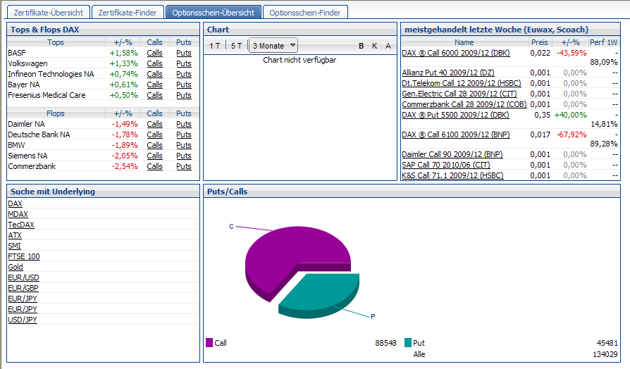 Rechts unten sehen Sie in einem übersichtlichen Tortendiagramm, wie sich aktuell die Optionsscheine auf die beiden Typen Call und Put verteilen.