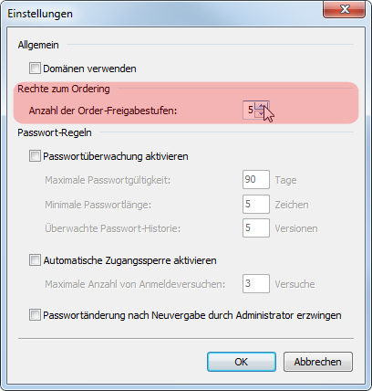Demzufolge wurde in der Benutzerverwaltung das Objekt-Recht "Orders freigeben" um dynamische Rechte zur Freigabe ergänzt. Die Anzahl der Order-Freigabestufen legen Sie wie folgt fest: