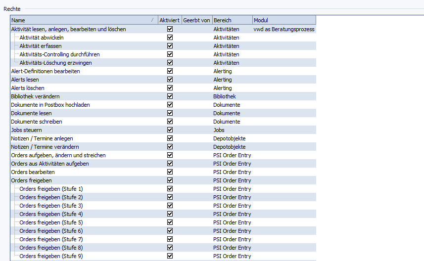 Die einzelnen Objekt-Rechte erscheinen unter dem Objekt-Recht "Orders freigeben". Verfügen Sie dann wiederum über das System-Recht "PSI Order Entry konfigurieren", dann können Sie im Infront Portfolio Manager über die per MM-Talk konfigurierbaren Freigaberegeln den Freigabeprozess auf Basis dieser Rechte definieren.