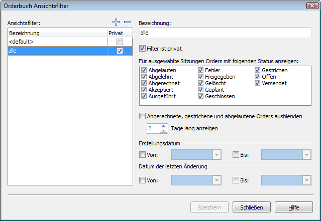 Status | Aktivieren bzw. deaktivieren Sie in diesem Bereich die Kontrollkästchen der Status, die ein- bzw. ausgeblendet werden sollen. Standardmäßig sind alle Status ausgewählt. Lesen Sie zur Liste der wichtigsten Status den folgenden Abschnitt Orderstatus im Orderbuch. |