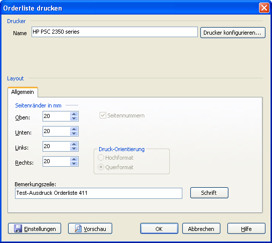 Im erscheinenden Dialogfenster "Orderliste drucken" können Sie wie gewohnt den Drucker auswählen und konfigurieren, Seitenränder festlegen und eine Bemerkungszeile einfügen.