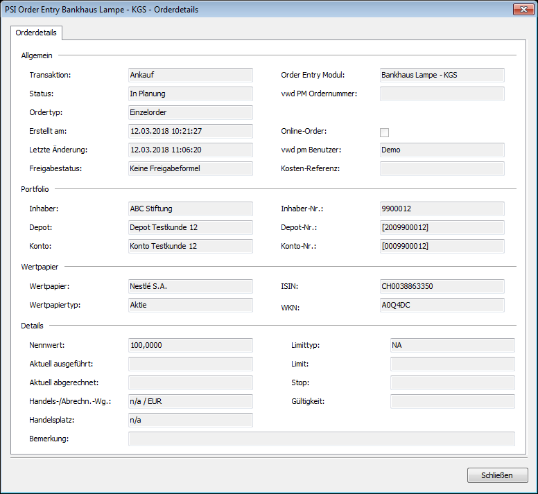 - Beenden Sie das Dialogfenster "PSI Order Entry – Orderdetails" mit dem Button "Schließen".