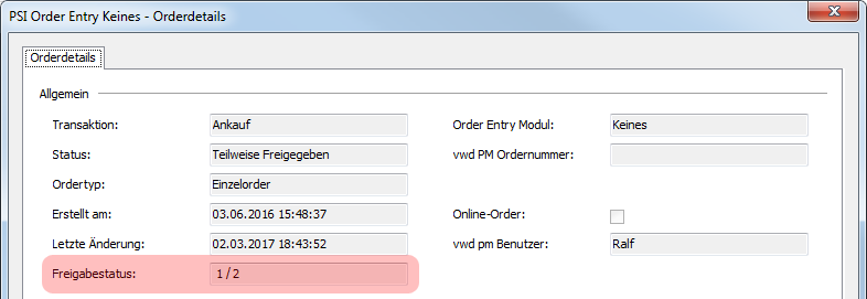 Den exakten Freigabestatus einer Order sehen Sie in den Orderdetails. Im Feld "Freigabestatus" werden für mehrstufige Freigabeprozesse die Zahl der aktuell bereits erfolgten und die Gesamtzahl der notwendigen Freigabestufen dargestellt: