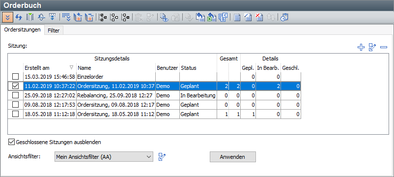 Ganz oben im Orderbuch befindet sich der Ordersitzungsfilter. Hier können Sie die im Orderbuch darzustellenden Ordersitzungen auswählen, neue, leere Ordersitzungen anlegen, Ordersitzungen bearbeiten oder löschen.
