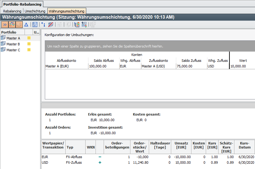 Auswirkungen der Währungsumschichtung: In der Spalte "Orderstücke/Wert" erscheint der kumulierte Wert in der jeweiligen Kontowährung, in der Spalte "Orderbeteiligungen" sehen Sie die Anzahl der Orderbeteiligungen. Hier werden für FX-Spot-Orders Zu- und Abfluss als jeweils eine Teilorder gezählt. Die Anzahl der Orders ist hier "2", es sind aber drei Konten "beteiligt". In der Spalte "Typ" wird für Abflusskonten der Typ "FX-Abfluss" und für Zuflusskonten der Typ "FX-Zufluss" eingeführt. Ist ein Konto wie im Beispiel das Konto "Master A (USD)" als Zu- und als Abflusskonto betroffen, dann entscheidet das resultierende Vorzeichen über den Typ.