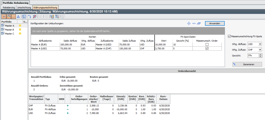 Dabei sehen Sie auch in der Orderübersicht oben die FX-Spot-Orders, im mittleren Bereich den Gesamtüberblick und unten die resultierenden "Netto-Orders" des aktuell ausgewählten Portfolios pro Währung bzw. pro Konto.