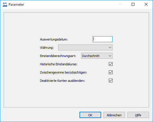 - Legen Sie die gewünschten Einstellungen der Parameter fest. Geben Sie für einen Parameter keine Werte an, so verwendet Infront Portfolio Manager die Standardwerte, z. B. im Feld "Auswertungsdatum" das aktuelle Datum bzw. das auf der Registerkarte "Start" in das Eingabefeld eingegebene Auswertungsdatum.