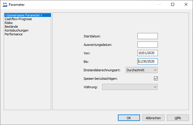 In dieser Liste sehen Sie abgekürzte Bezeichnungen der Standardvorlagen, also z. B. den Eintrag "Cashflow-Prognose" für die Auswertung "Customer Account – Cashflow-Prognose" usw.- Schließen Sie das Dialogfenster "Parameter" mit "OK".