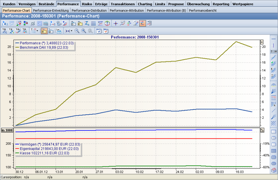 Der Performance-Chart wird standardmäßig immer für das aktuelle Kalenderjahr ausgewertet. Änderungen nehmen Sie über den Parameterdialog (<STRG>+<A>) vor.