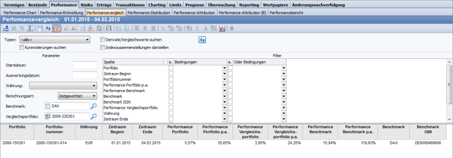 Vergleichen Sie mithilfe dieser Auswertung die Performance von zwei oder mehreren Portfolios. Diese Auswertung finden Sie standardmäßig im Workspace von Gruppen, Inhabern und Portfolios auf dem Worksheet "Performance", "Performancevergleich".