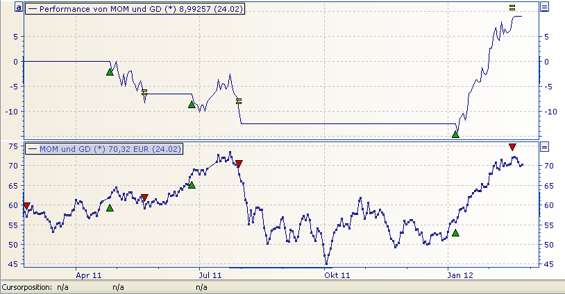 Klicken Sie dann in der Symbolleiste des Chartfensters auf das Icon "Performance einblenden". Die Performance des Handelssystems wird berechnet und im Chartfenster dargestellt.