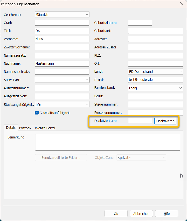 In den Personen-Eigenschaften finden Sie das neue Feld "Deaktiviert am" sowie den neuen Button "Deaktivieren". Dieser Button ist nur sichtbar, wenn diese Person noch nicht deaktiviert ist.