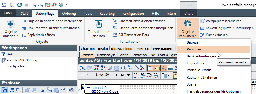 Um neue Personen anzulegen oder bestehende Personen zu bearbeiten, wählen Sie im Menüband auf der Registerkarte "Datenpflege" den Befehl PERSONEN im Menü des Icons "Objekte verwalten".