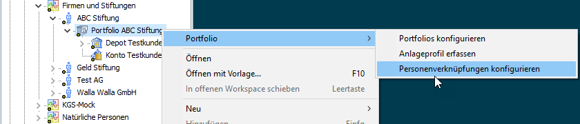 - Wählen Sie im Kontextmenü des Portfolios im Explorer den Befehl PORTFOLIO, PERSONENVERKNÜPFUNGEN KONFIGURIEREN.