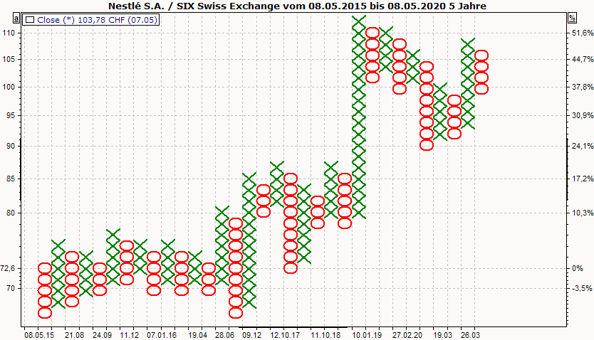Der Point-and-Figure-Chart besteht aus einer Kombination von X- und O-Kästchen, die auch als Boxen bezeichnet werden. Das X steht dabei für steigende Kurse (Aufwärtstrend), das O für fallende Kurse (Abwärtstrend). Die Darstellung wird durch zwei Angaben festgelegt: